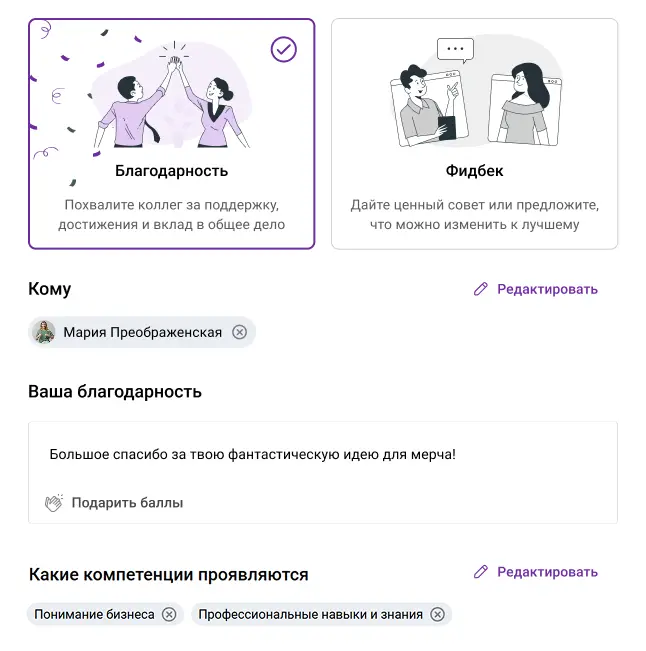 Фидбек может быть публичным или приватным, он сразу фиксируется в профиле и становится частью истории сотрудника.