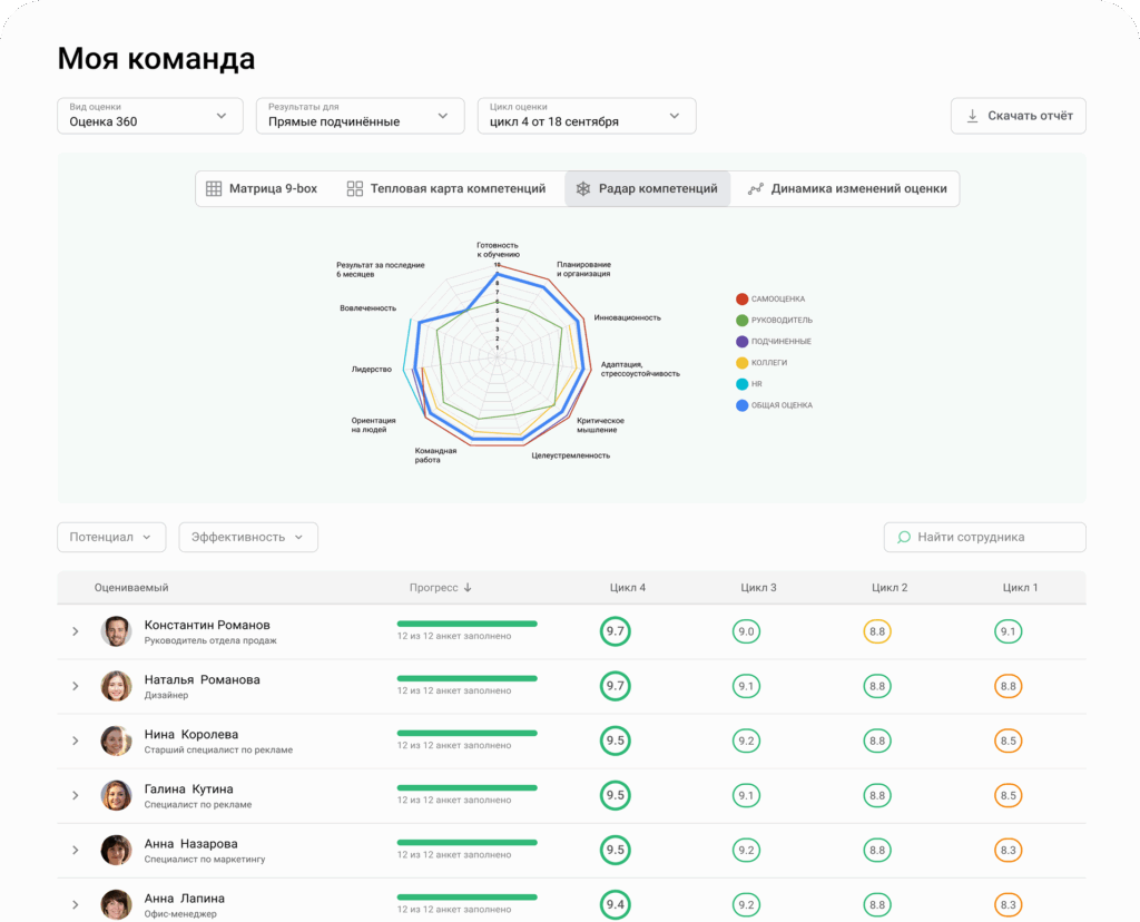 - автоматические отчеты с рекомендациями по команде и каждому сотруднику.