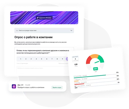 Stay-интервью, несмотря на все преимущества, трудозатратное мероприятие. Еще один способ предупреждать увольнения ключевых сотрудников компании и способствовать их удержанию — опрос вовлеченности и лояльности. Из-за того, что опрос проводится анонимно, вы не сможете узнать вовлеченность конкретного человека, но будете осведомлены о средней температуре по команде.